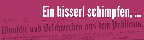Bei meiner gemütlichen Nachmittagslesung im Café Korb am 14.11. stehen diese Beschwerden über die Zustände im Wien der Kaiserzeit diesmal im Mittelpunkt. Hunzerl, die über den Restauranttisch spazieren, eingefrorene öffentliche Uhren, vollgestopfte Tramways – was gab es da nicht alles, worüber man sich herrlich echauffieren konnte!